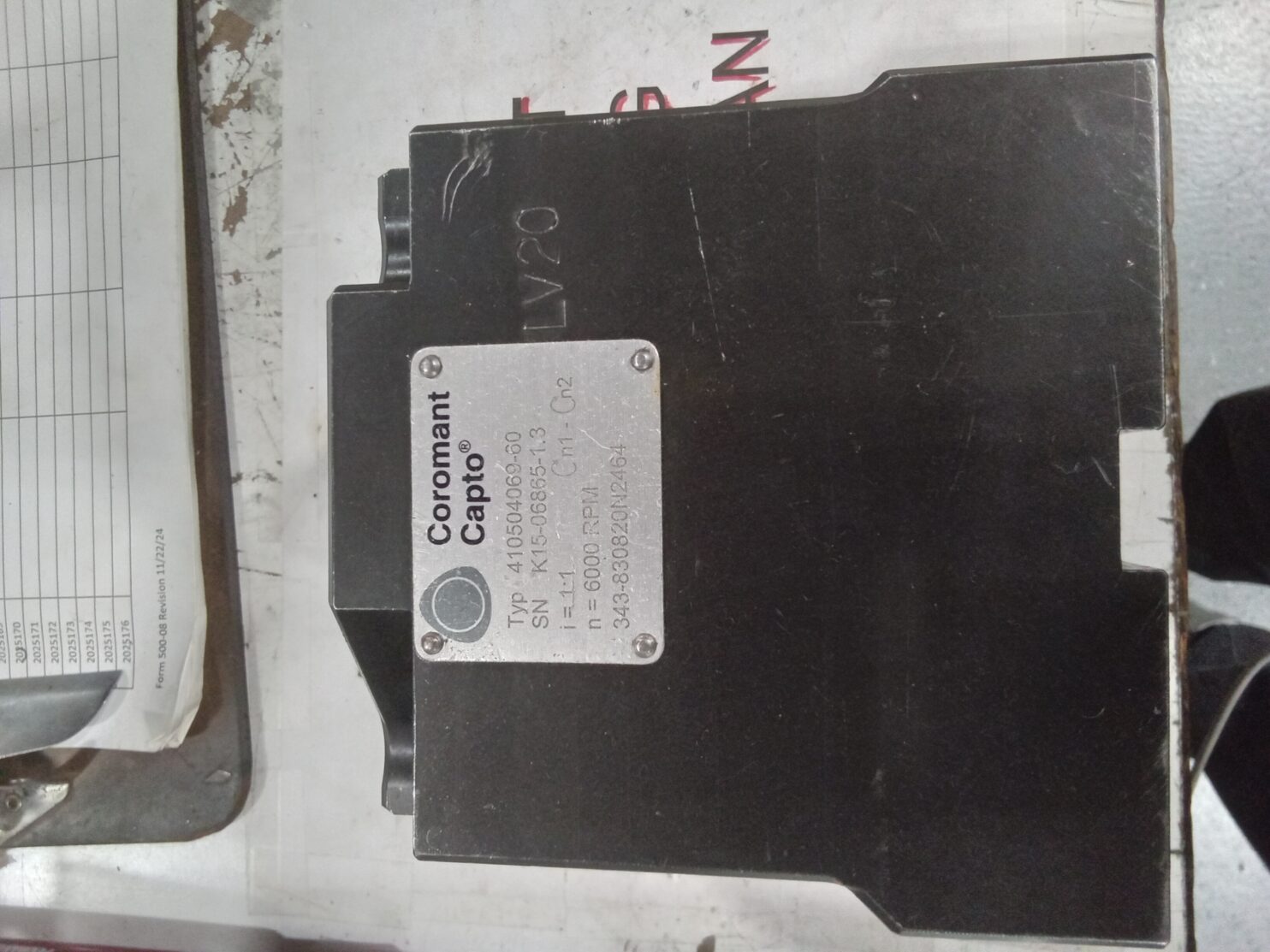 This unit is a tool spindle module used in live tooling or indexing systems. The Coromant Capto interface is visible on the housing. The listed 6000 RPM rating indicates moderate-speed applications. The rugged case hints at industrial milling or turning duty.