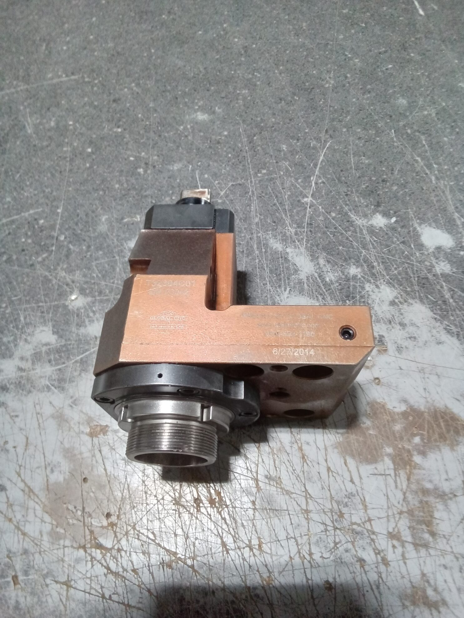 This image shows a Global CNC right-angle live tooling head. It is stamped with the date 6/27/2014. The threaded nose and mounting ports are clearly visible.