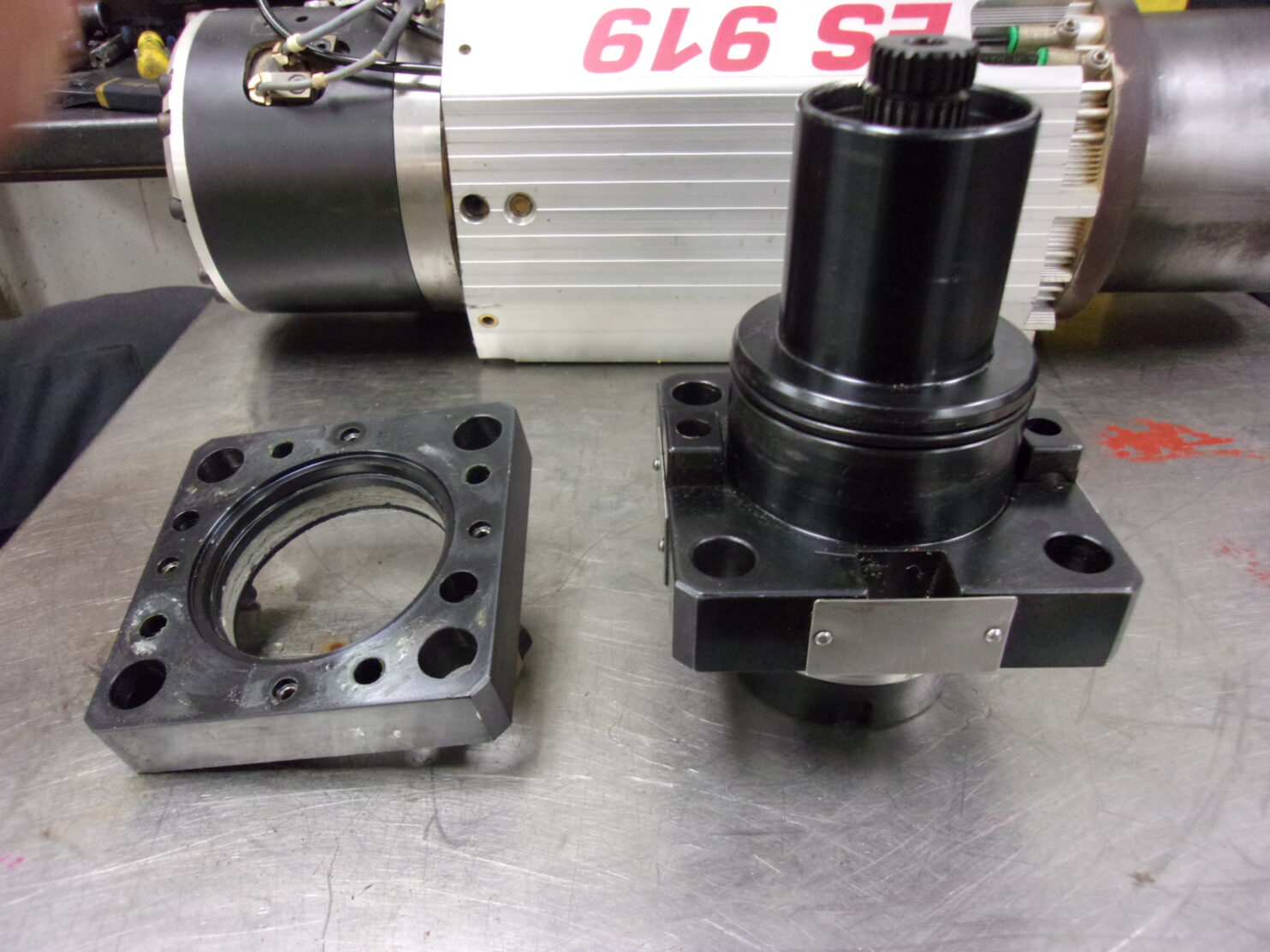 This photo shows a black live tool holder assembly paired with a square mounting flange. The main unit stands upright on a stainless workbench. A small toothed gear is visible at the top of the cylindrical shaft.